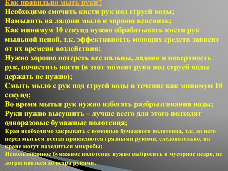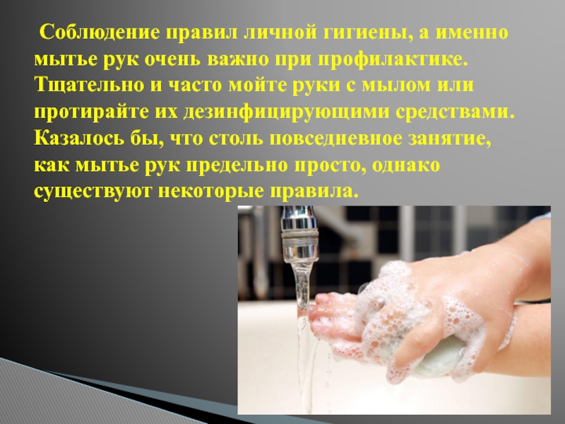 Слайд 10 Соблюдение правил личной гигиены, а именно мытье рук очень важно при