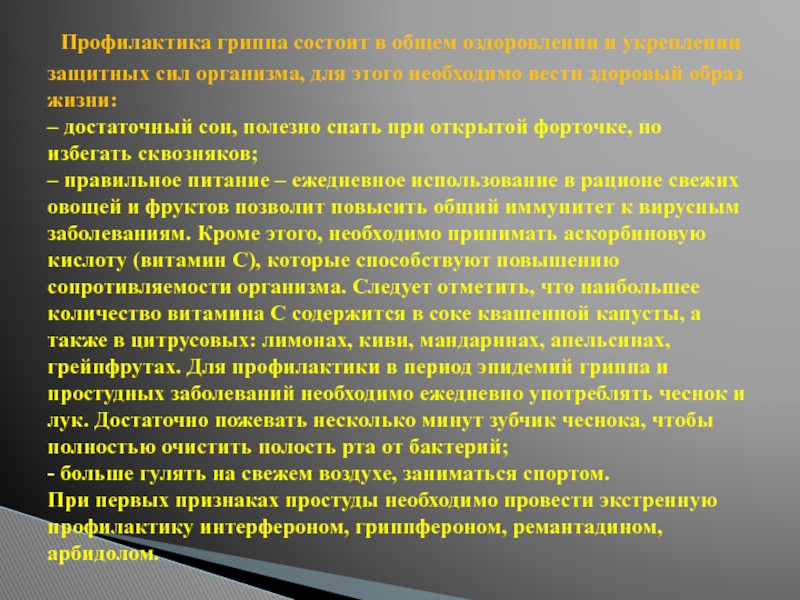 Слайд 13 Профилактика гриппа состоит в общем оздоровлении и укреплении защитных сил
