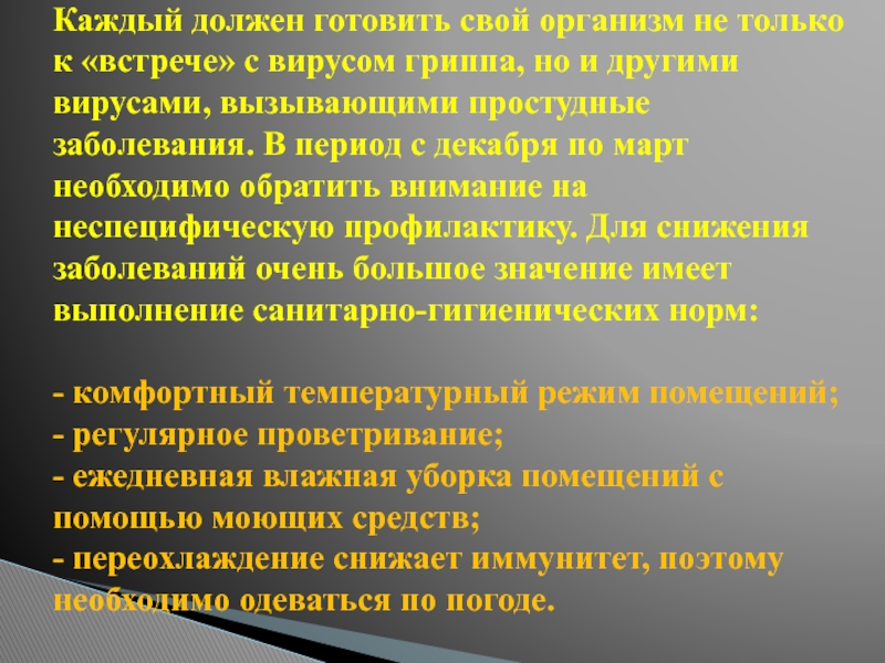гриппа, но и другими вирусами, вызывающими простудные заболевания. В период с декабря по март необходимо обратить внимание на неспецифическую профилактику. Для снижения заболеваний очень большое значение имеет выполнение санитарно-гигиенических норм:
