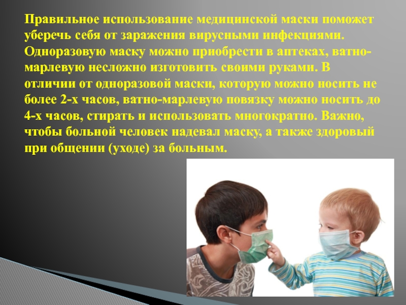 Слайд 14Правильное использование медицинской маски поможет уберечь себя от заражения вирусными инфекциями.