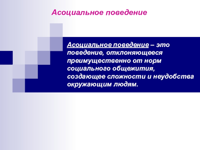Слайд 5Асоциальное поведение – это поведение, отклоняющееся преимущественно от норм социального общежития,