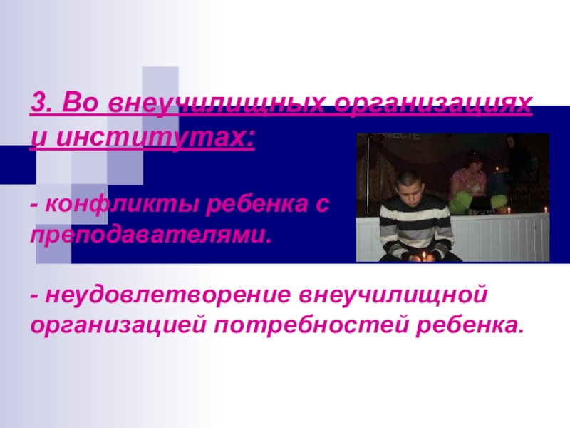 - Институты семьи и образовательной организации а лице родителей, учителей, социальных педагогов и педагогов-психологов.
