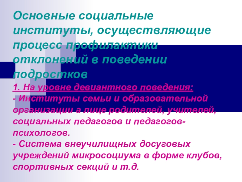 Слайд 21Основные социальные институты, осуществляющие процесс профилактики отклонений в поведении подростков