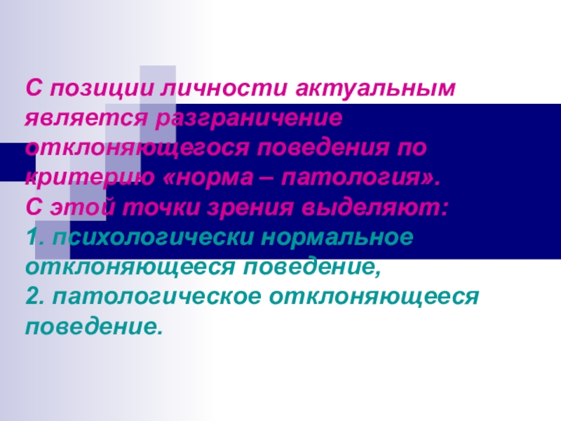 Слайд 7С позиции личности актуальным является разграничение отклоняющегося поведения по критерию «норма