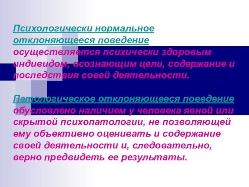 Слайд 8Психологически нормальное отклоняющееся поведение осуществляется психически здоровым индивидом, осознающим цели, содержание