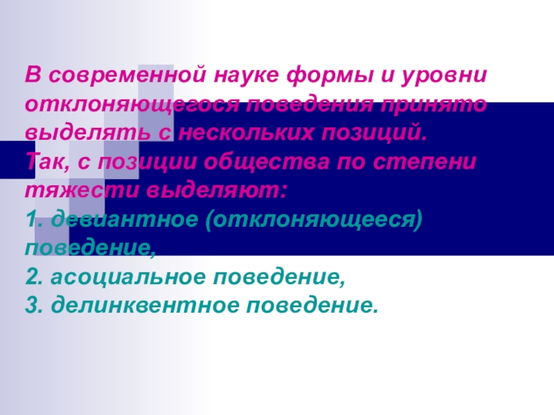 Слайд 3В современной науке формы и уровни отклоняющегося поведения принято выделять с
