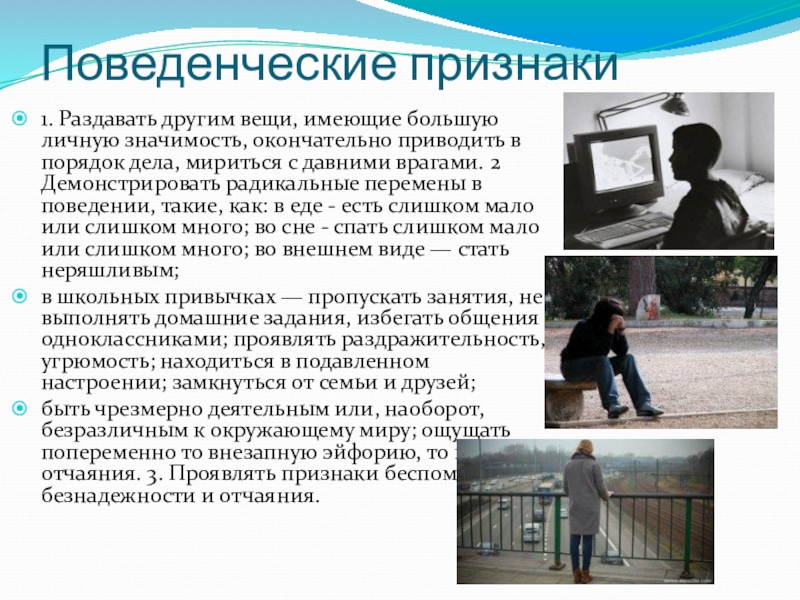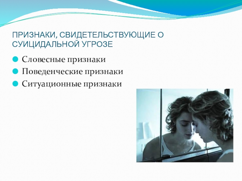 Слайд 5ПРИЗНАКИ, СВИДЕТЕЛЬСТВУЮЩИЕ О СУИЦИДАЛЬНОЙ УГРОЗЕ