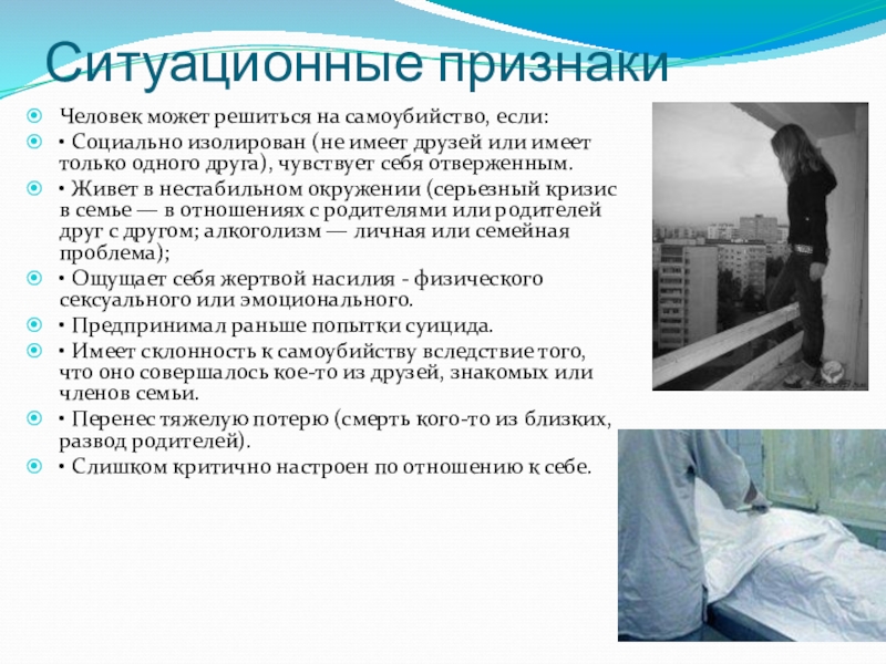 • Имеет склонность к самоубийству вследствие того, что оно совершалось кое-то из друзей, знакомых или членов семьи.