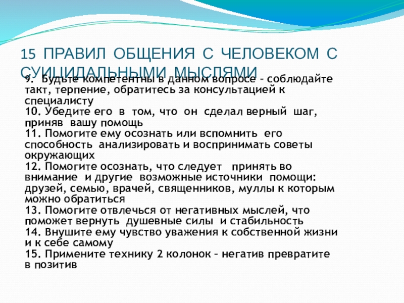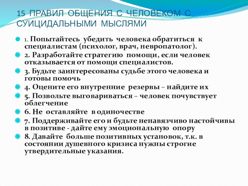 Слайд 1215 ПРАВИЛ ОБЩЕНИЯ С ЧЕЛОВЕКОМ С СУИЦИДАЛЬНЫМИ МЫСЛЯМИ