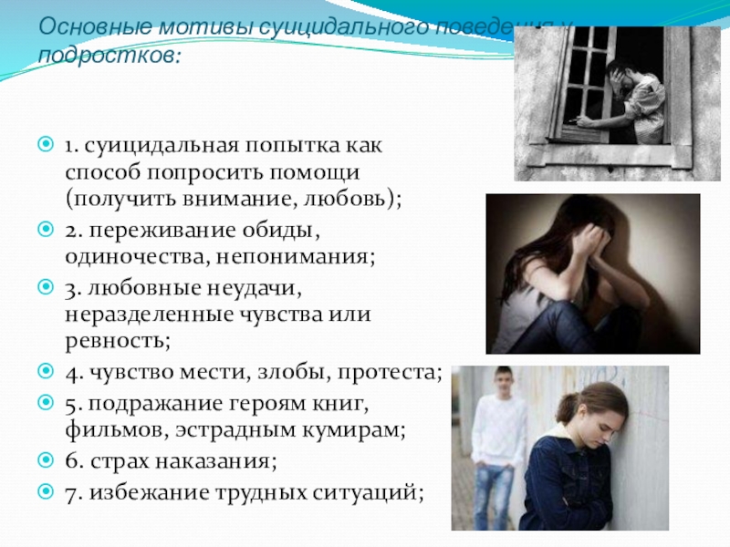 Слайд 9Основные мотивы суицидального поведения у подростков: