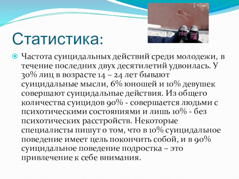 удвоилась. У 30% лиц в возрасте 14 – 24 лет бывают суицидальные мысли, 6% юношей и 10% девушек совершают суицидальные действия. Из общего количества суицидов 90% - совершается людьми с психотическими состояниями и лишь 10% - без психотических расстройств. Некоторые специалисты пишут о том, что в 10% суицидальное поведение имеет цель покончить собой, и в 90% суицидальное поведение подростка – это привлечение к себе внимания.