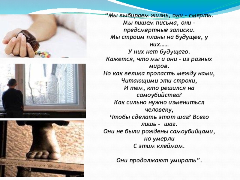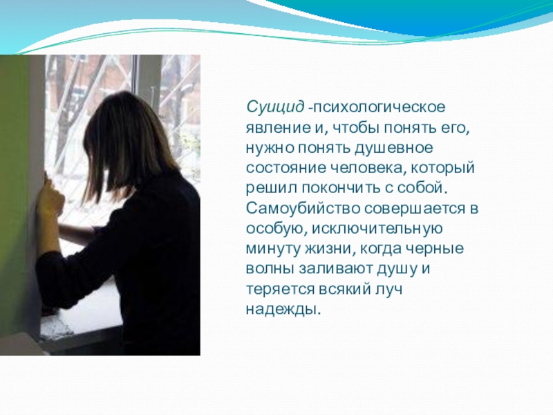 Слайд 2Суицид -психологическое явление и, чтобы понять его, нужно понять душевное состояние