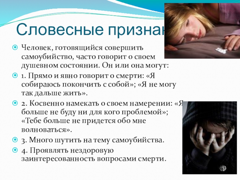 1. Прямо и явно говорит о смерти: «Я собираюсь покончить с собой»; «Я не могу так дальше жить».