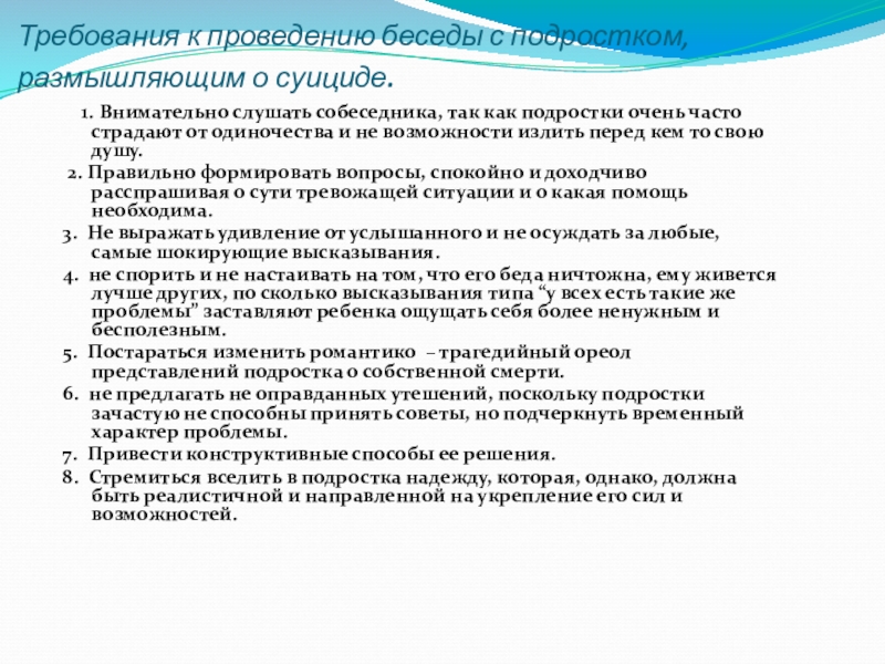 Слайд 14Требования к проведению беседы с подростком, размышляющим о суициде.