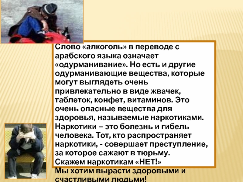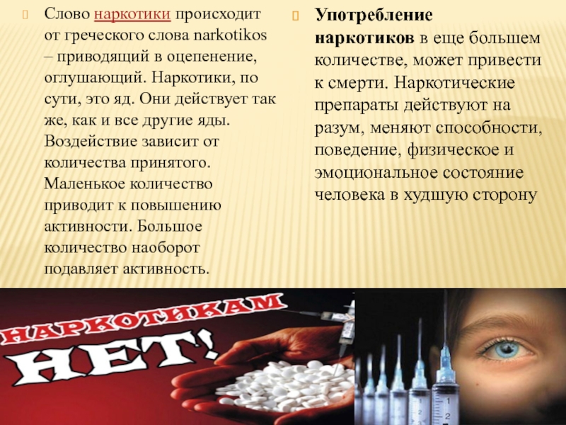 Употребление наркотиков в еще большем количестве, может привести к смерти. Наркотические препараты действуют на разум, меняют способности, поведение, физическое и эмоциональное состояние человека в худшую сторону