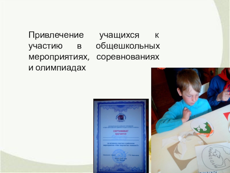 Слайд 15Привлечение учащихся к участию в общешкольных мероприятиях, соревнованиях и олимпиадах