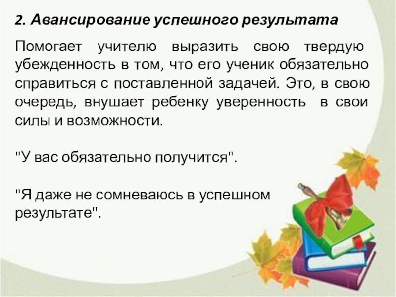 что его ученик обязательно справиться с поставленной задачей. Это, в свою очередь, внушает ребенку уверенность в свои силы и возможности.