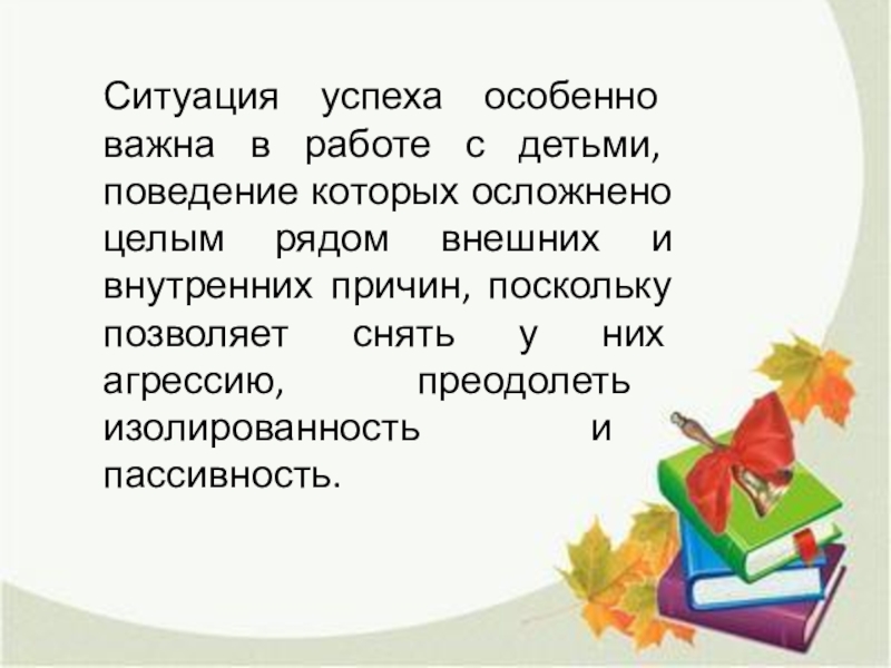 Слайд 18Ситуация успеха особенно важна в работе с детьми, поведение которых осложнено