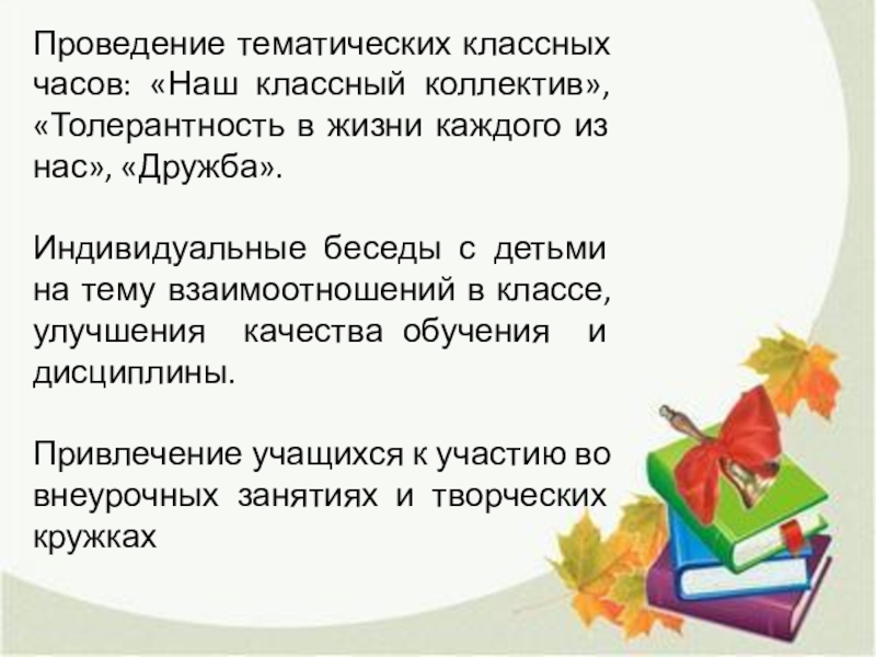 Слайд 16Проведение тематических классных часов: «Наш классный коллектив», «Толерантность в жизни каждого