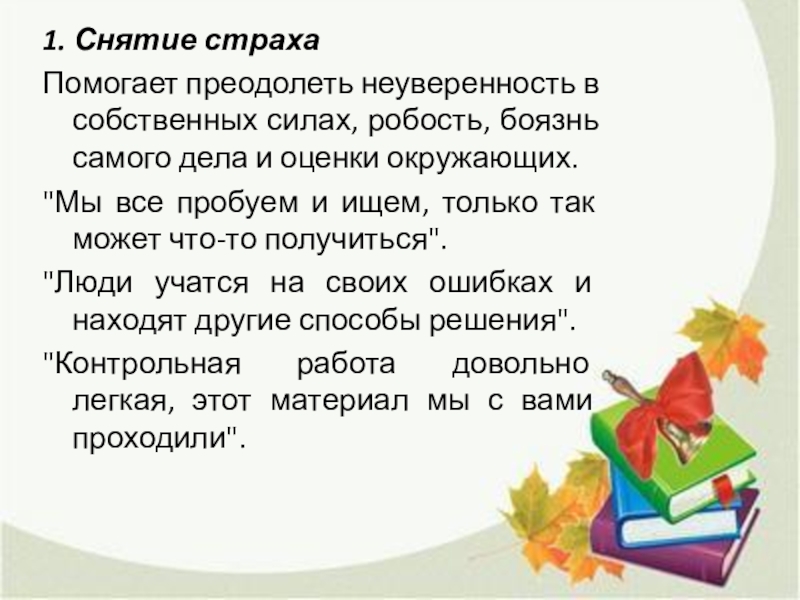 Помогает преодолеть неуверенность в собственных силах, робость, боязнь самого