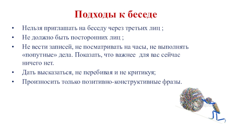 Не вести записей, не посматривать на часы, не выполнять «попутные» дела. Показать, что важнее для вас сейчас ничего нет.