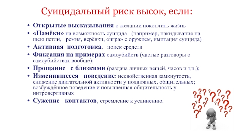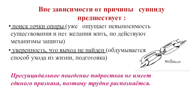 Слайд 10Вне зависимости от причины суициду предшествует :