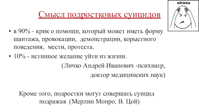 Кроме того, подростки могут совершать суицид подражая (Мерлин Монро, В. Цой)