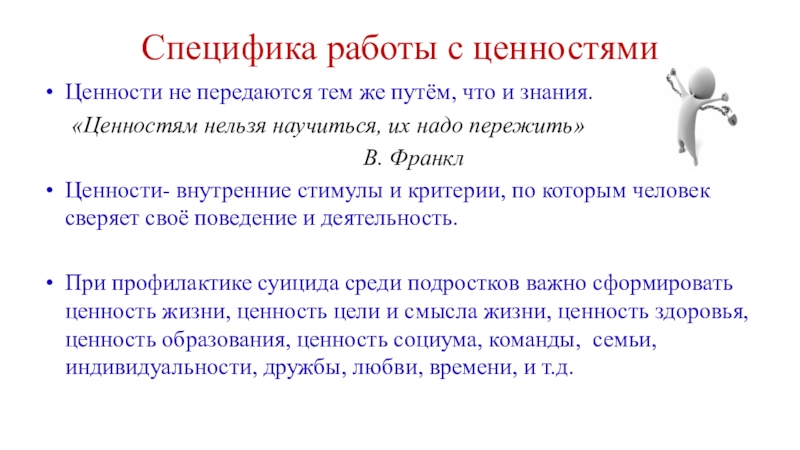 При профилактике суицида среди подростков важно сформировать ценность жизни, ценность цели и смысла жизни, ценность здоровья, ценность образования, ценность социума, команды, семьи, индивидуальности, дружбы, любви, времени, и т.д.