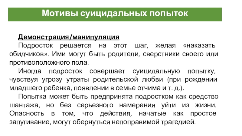 Попытка может быть предпринята подростком как средство шантажа, но без серьезного намерения уйти из жизни. Опасность в том, что действия, начатые как простое запугивание, могут обернуться непоправимой трагедией.