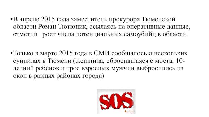Только в марте 2015 года в СМИ сообщалось о нескольких суицидах в Тюмени (женщина, сбросившаяся с моста, 10-летний ребёнок и трое взрослых мужчин выбросились из окон в разных районах города)
