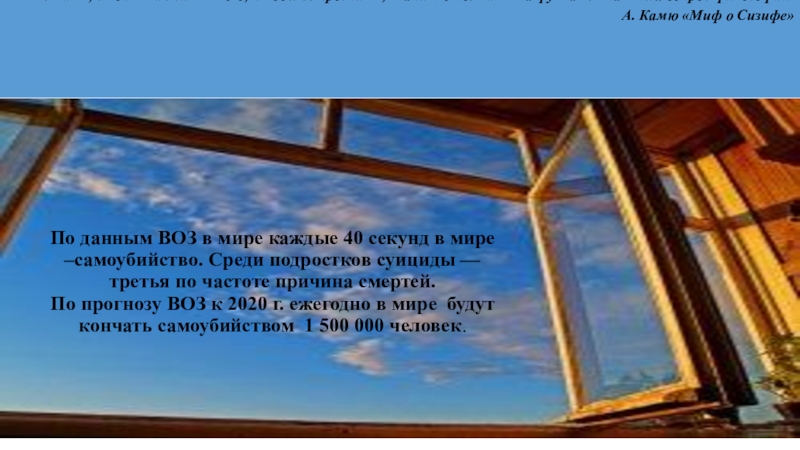 По прогнозу ВОЗ к 2020 г. ежегодно в мире будут кончать самоубийством 1 500 000 человек.