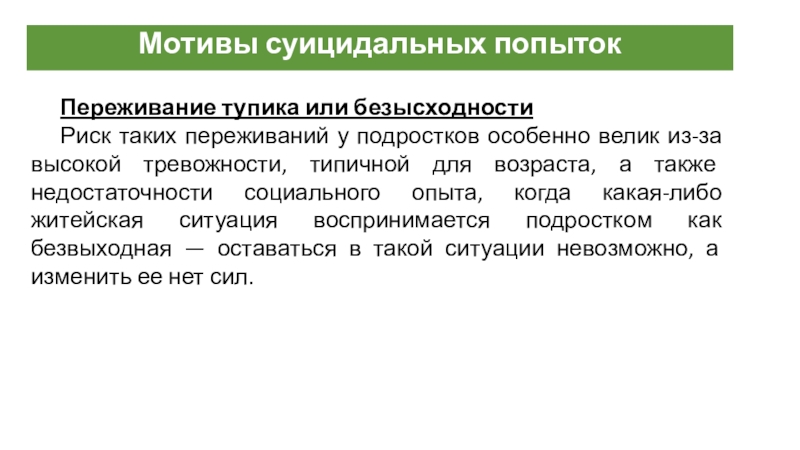 велик из-за высокой тревожности, типичной для возраста, а также недостаточности социального опыта, когда какая-либо житейская ситуация воспринимается подростком как безвыходная — оставаться в такой ситуации невозможно, а изменить ее нет сил.