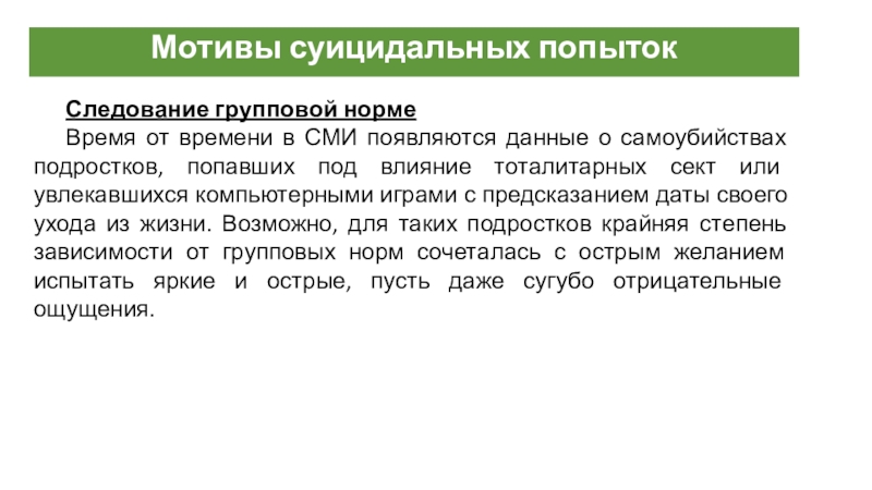 о самоубийствах подростков, попавших под влияние тоталитарных сект или увлекавшихся компьютерными играми с предсказанием даты своего ухода из жизни. Возможно, для таких подростков крайняя степень зависимости от групповых норм сочеталась с острым желанием испытать яркие и острые, пусть даже сугубо отрицательные ощущения.
