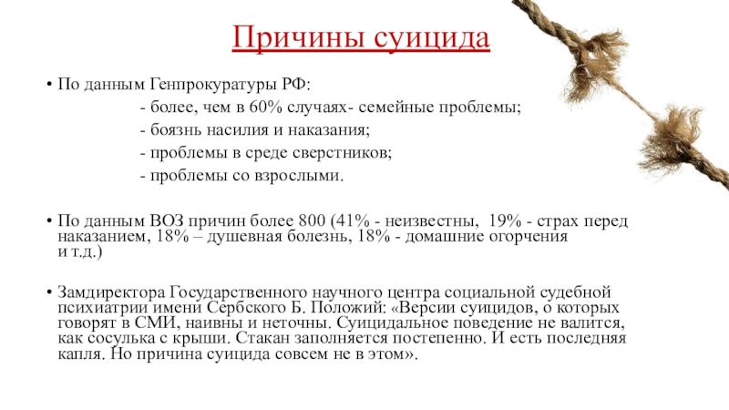 Замдиректора Государственного научного центра социальной судебной психиатрии имени Сербского Б. Положий: «Версии суицидов, о которых говорят в СМИ, наивны и неточны. Суицидальное поведение не валится, как сосулька с крыши. Стакан заполняется постепенно. И есть последняя капля. Но причина суицида совсем не в этом».