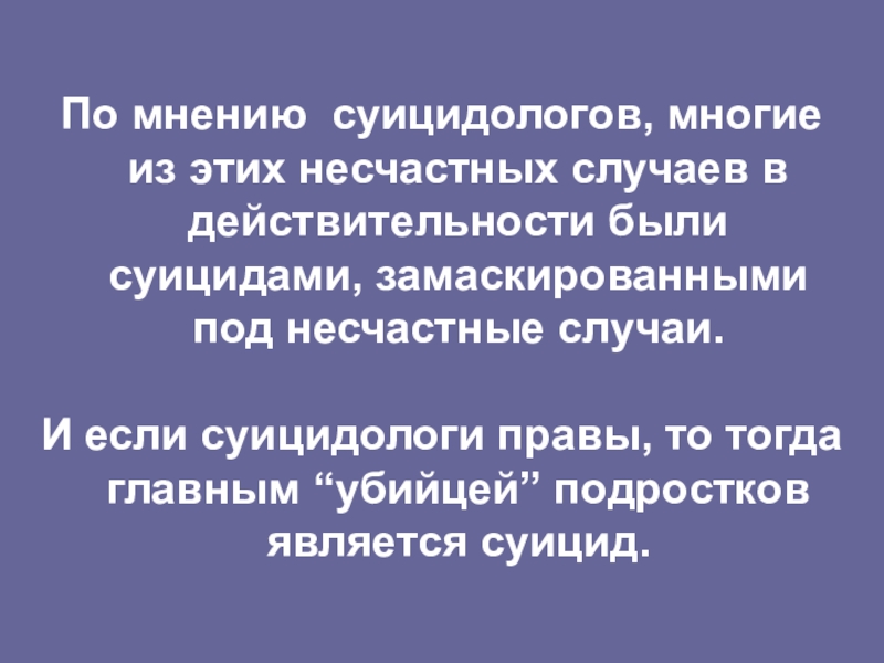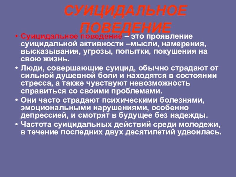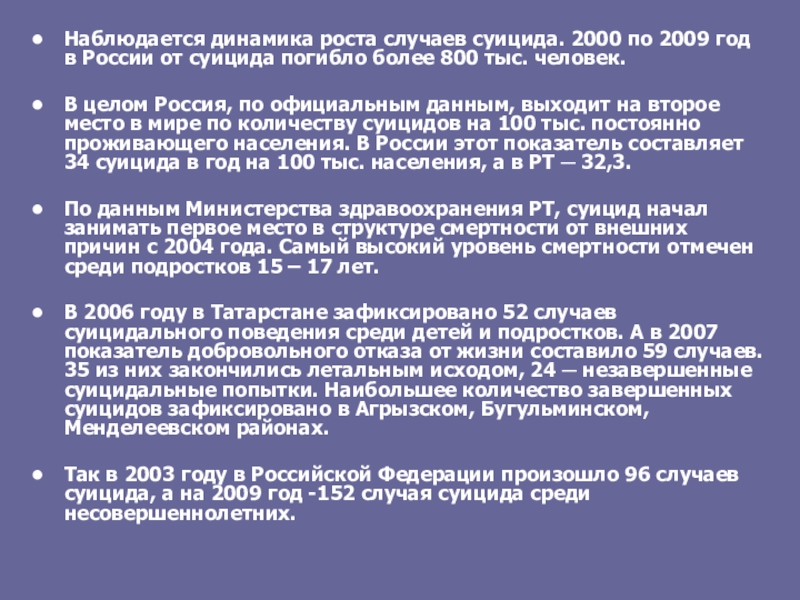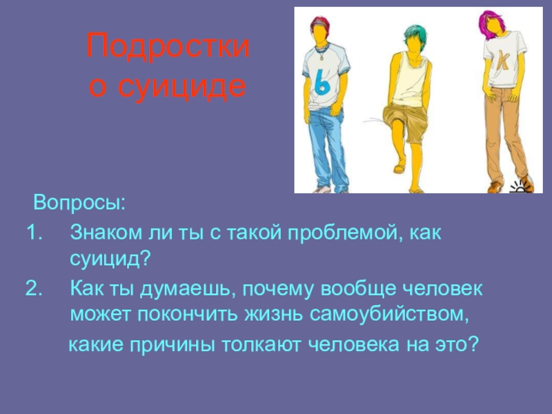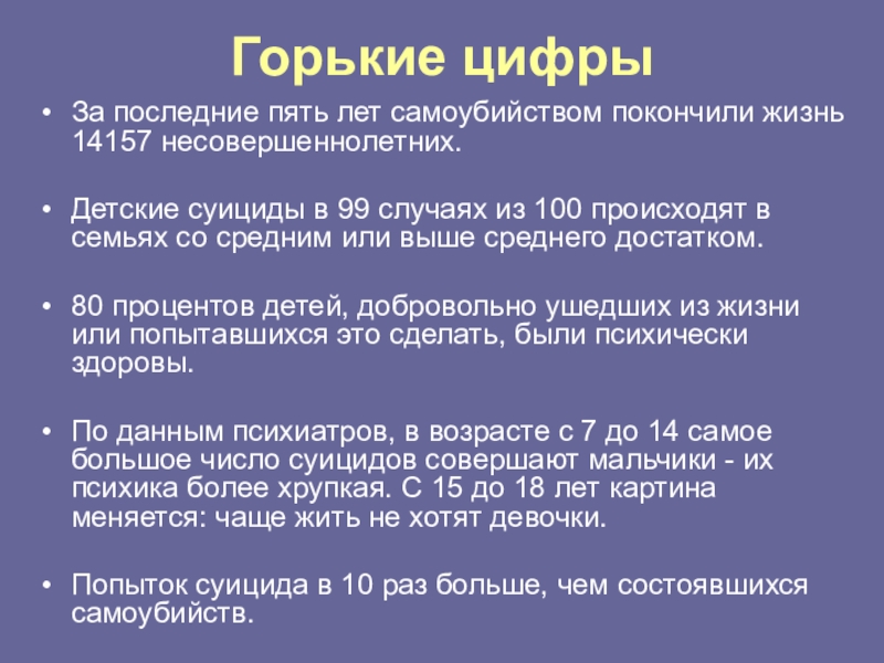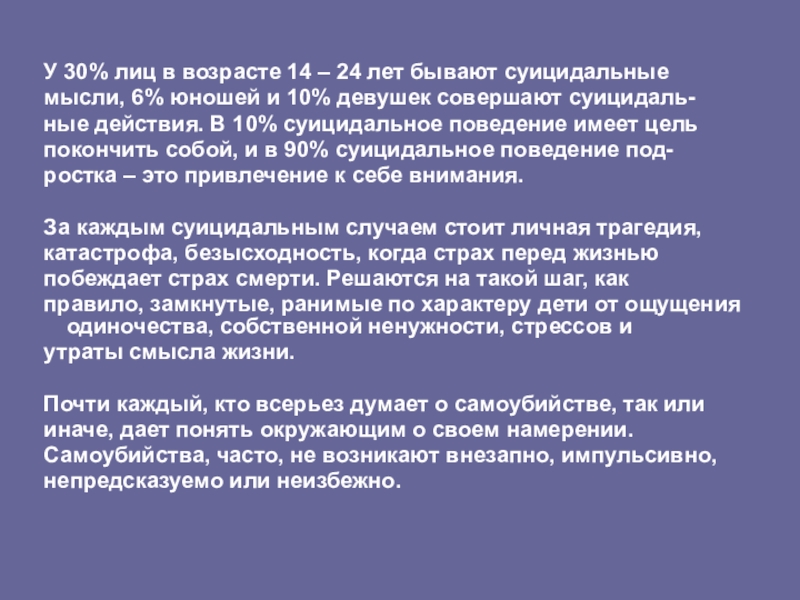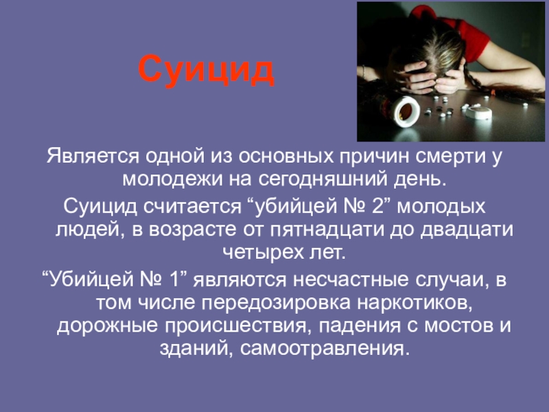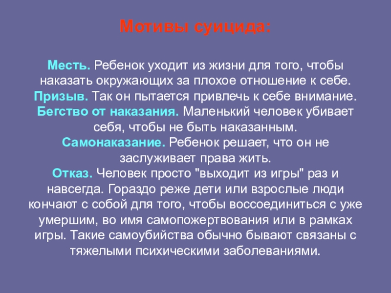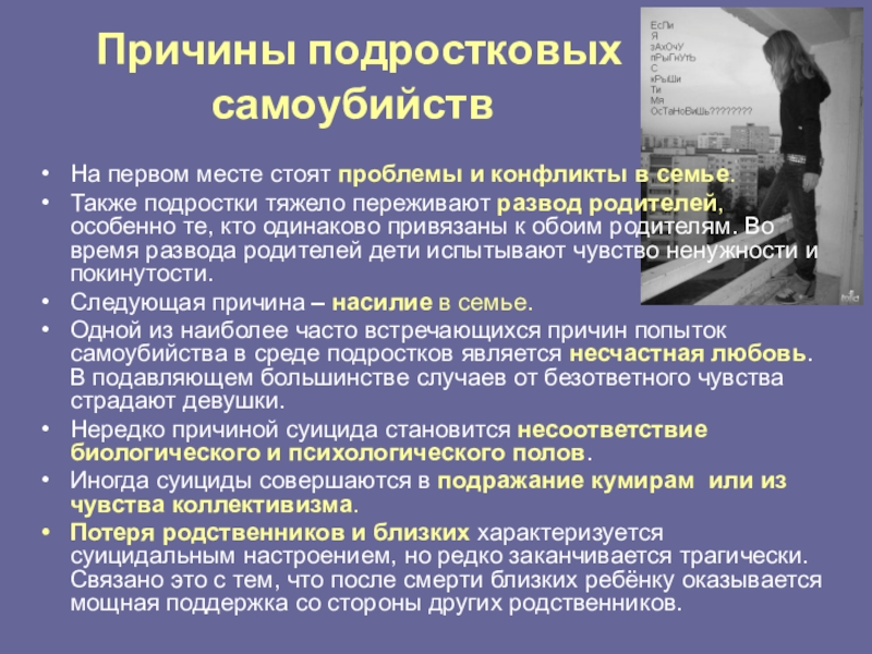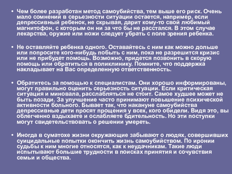Постарайтесь определить серьезность возможного самоубийства. Ведь намерения ребенка могут различаться, начиная с мимолетных, расплывчатых мыслей о такой «возможности» и заканчивая разработанным планом суицида путем отравления, прыжка с высоты, использования огнестрельного оружия или веревки. Очень важно выявить и другие факторы, такие, как алкоголизм, употребление наркотиков, эмоциональные нарушения.