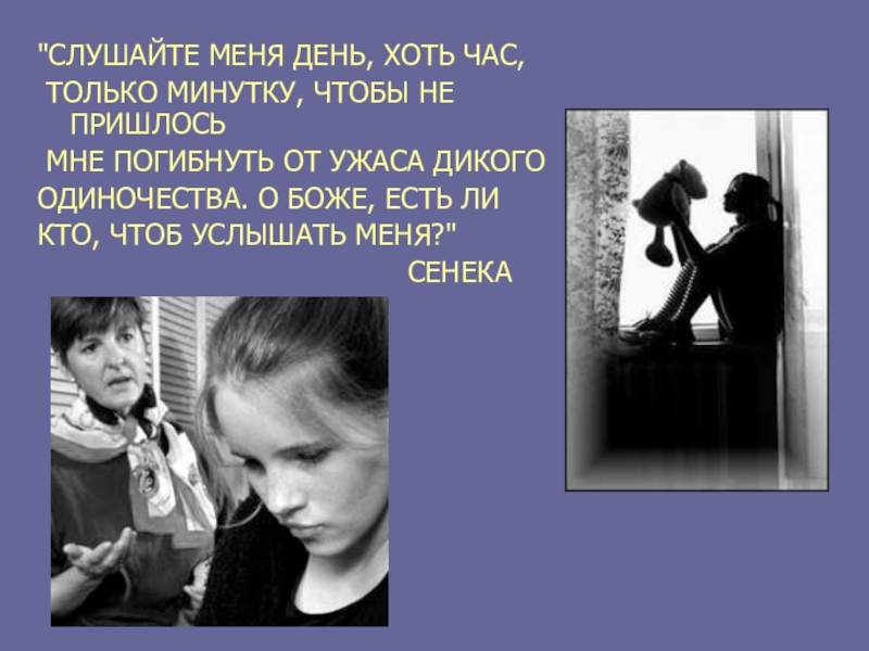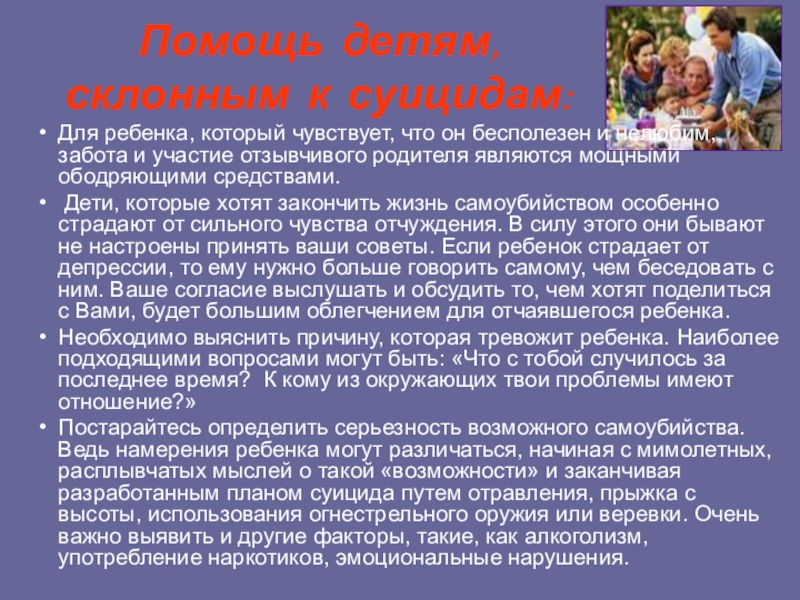 Дети, которые хотят закончить жизнь самоубийством особенно страдают от сильного чувства отчуждения. В силу этого они бывают не настроены принять ваши советы. Если ребенок страдает от депрессии, то ему нужно больше говорить самому, чем беседовать с ним. Ваше согласие выслушать и обсудить то, чем хотят поделиться с Вами, будет большим облегчением для отчаявшегося ребенка.