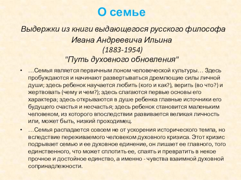 …Семья распадается совсем не от ускорения исторического темпа, но вследствие переживаемого человеком духовного кризиса. Этот кризис подрывает семью и ее духовное единение, он лишает ее главного, того единственного, что может сплотить ее, спаять и превратить в некое прочное и достойное единство, а именно - чувства взаимной духовной сопринадлежности.