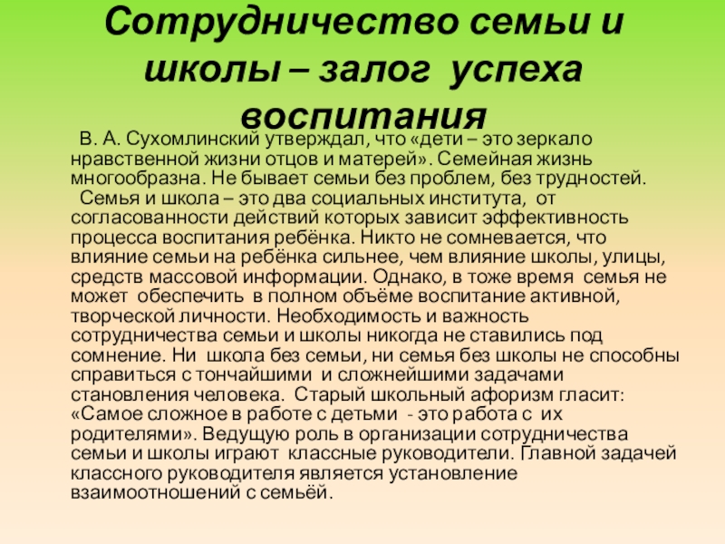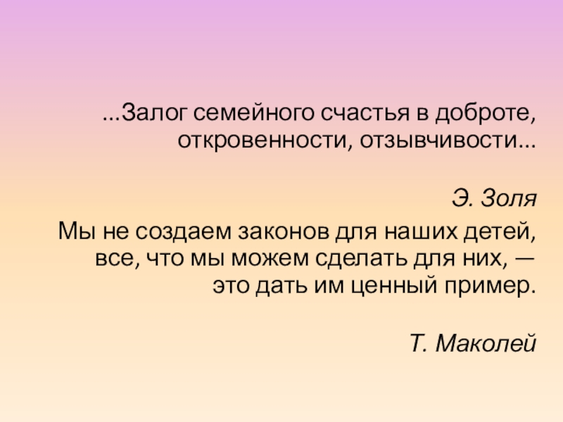 …Семья является первичным лоном человеческой культуры… Здесь пробуждаются и начинают развертываться дремлющие силы личной души; здесь ребенок научается любить (кого и как?), верить (во что?) и жертвовать (чему и чем?); здесь слагаются первые основы его характера; здесь открываются в душе ребенка главные источники его будущего счастья и несчастья; здесь ребенок становится маленьким человеком, из которого впоследствии развивается великая личность или, может быть, низкий проходимец.
