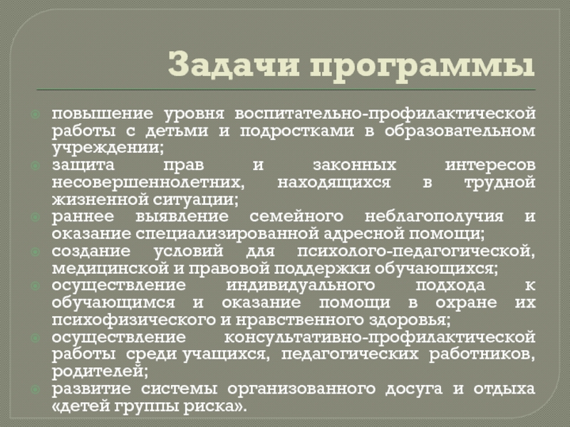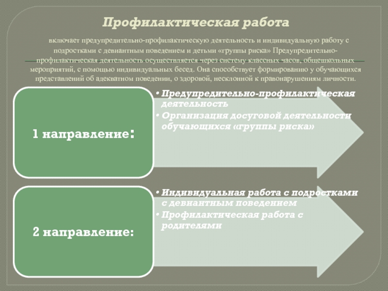 выявление и постановка на учёт детей с девиантным поведением, вовлечение их в спортивные секции, кружки, внеурочную занятость.
