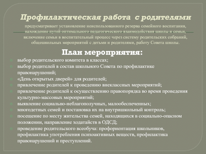 проведение родительского всеобуча: профориентация школьников, профилактика употребления психоактивных веществ, профилактика правонарушений и преступлений.