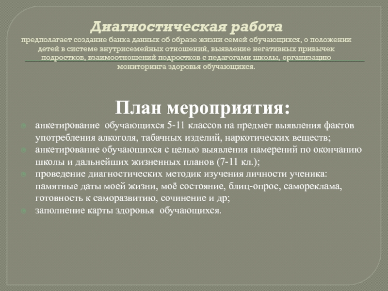 проведение диагностических методик изучения личности ученика: памятные даты моей жизни, моё состояние, блиц-опрос, самореклама, готовность к саморазвитию, сочинение и др;