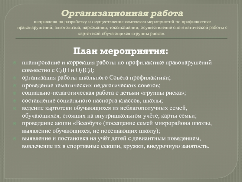 планирование и коррекция работы по профилактике правонарушений совместно с СДН и ОДСД;