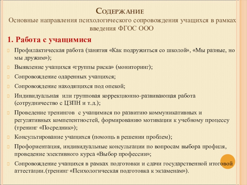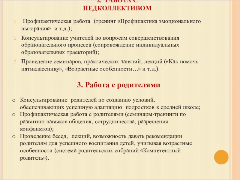 Консультирование родителей по созданию условий, обеспечивающих успешную адаптацию подростков к средней школе;
