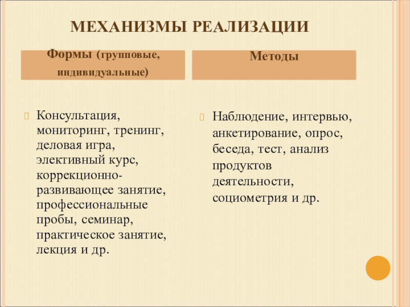 Наблюдение, интервью, анкетирование, опрос, беседа, тест, анализ продуктов деятельности, социометрия и др.