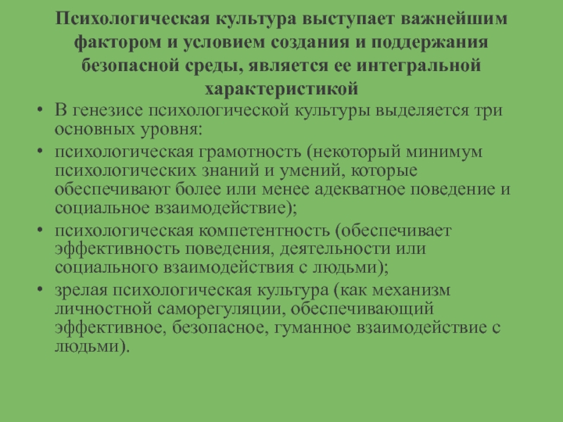 Слайд 30Психологическая культура выступает важнейшим фактором и условием создания и поддержания безопасной
