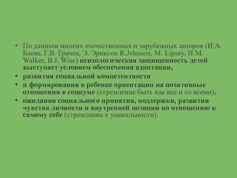 Эриксон R.Johnson, M. Lipsey, H.M. Walker, B.J. Wise) психологическая защищенность детей выступает условием обеспечения адаптации,