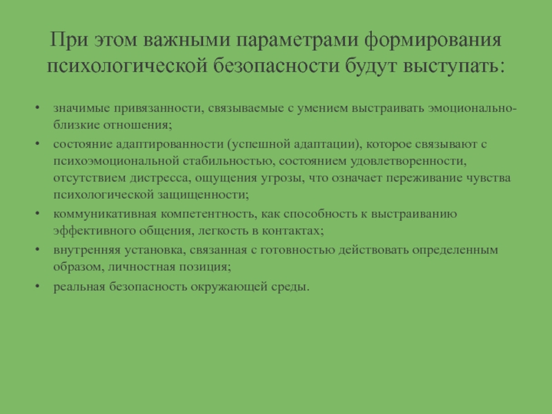 Слайд 8При этом важными параметрами формирования психологической безопасности будут выступать: