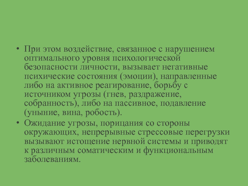 вызывает негативные психические состояния (эмоции), направленные либо на активное реагирование, борьбу с источником угрозы (гнев, раздражение, собранность), либо на пассивное, подавление (уныние, вина, робость).