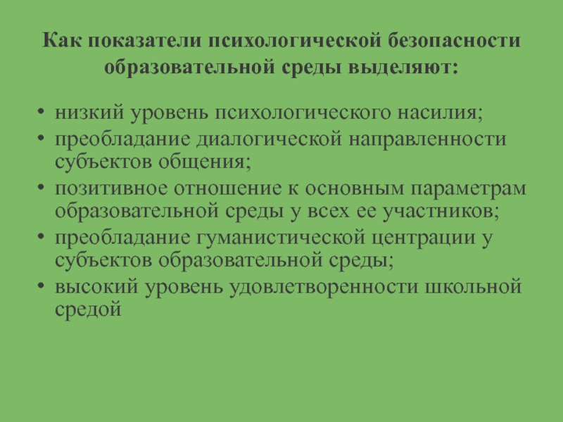 Слайд 29Как показатели психологической безопасности образовательной среды выделяют: