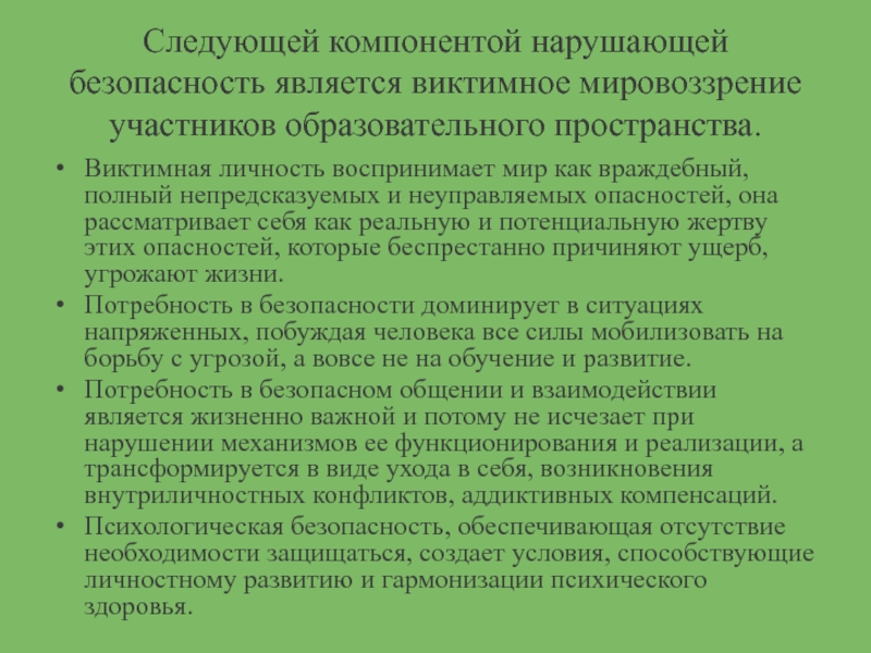 Слайд 26Следующей компонентой нарушающей безопасность является виктимное мировоззрение участников образовательного пространства.